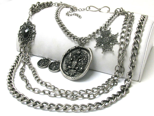 WHOLESALE MULTI LAYER ANTIQUE METAL CHAIN AND CHARM DANGLE NECKLACE EARRING SET 361257