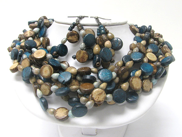 WHOLESALE ECO FRIENDLY MULTI ROW WOODEN BEAD NECKLACE AND EARRING SET 362428