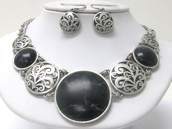 WHOLESALE BOUTIQUE STYLE NATURAL STONE AND TEXTURED METAL DISK LINK NECKLACE AND EARRING SET 362624