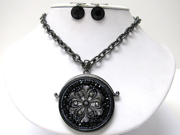 Antique style crystal stud metal art round medallion necklace earring set