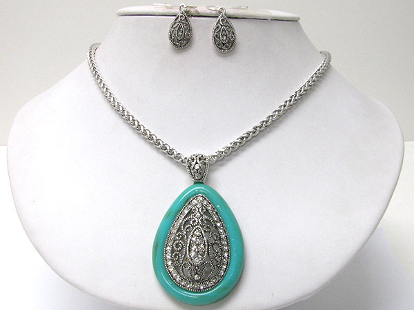 WHOLESALE FORMICA STONE AND FILIGREE METAL TEAR DROP PENDANT NECKLACE EARRING SET 363476