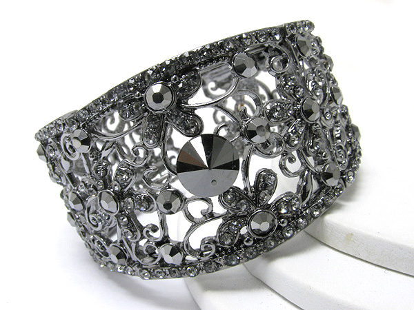 Crystal and metal filigree cuff bangle