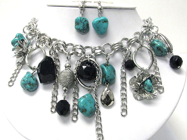 WHOLESALE MULTI NATURAL STONE AND FACET GLASS DANGLE NECKLACE EARRING SET 363870
