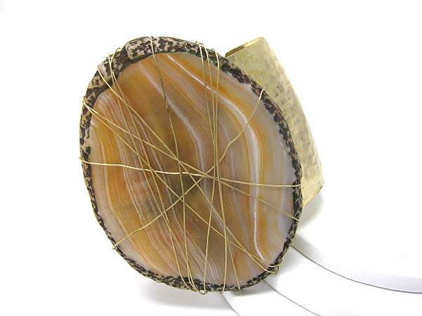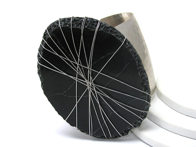 Oval flat natural stone wired metal cuff bangle