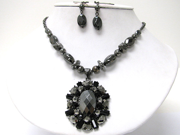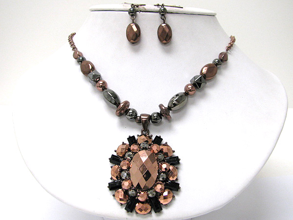 WHOLESALE CRYSTAL AND FACET METALLIC STONE MEDALLION NECKLACE EARRING SET 364671