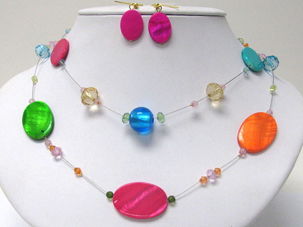 Colored shell disk and glass bead illusion necklace earring set