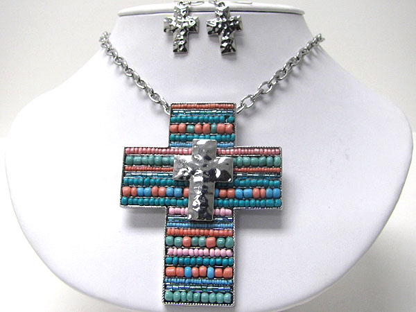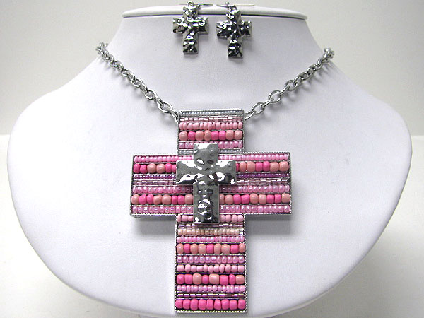 WHOLESALE MEATL CROSS ON LARGE SEED BEAD FILLED CROSS NECKLACE EARRING SET 365583