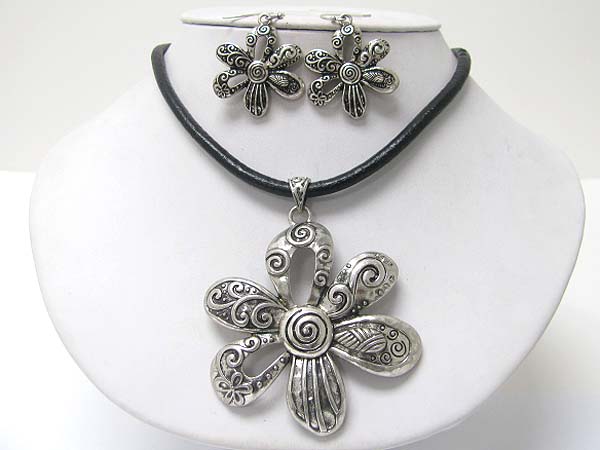 WHOLESALE TEXTURED METAL ART DECO FLOWER PENDANT NECKLACE EARRING SET 366114