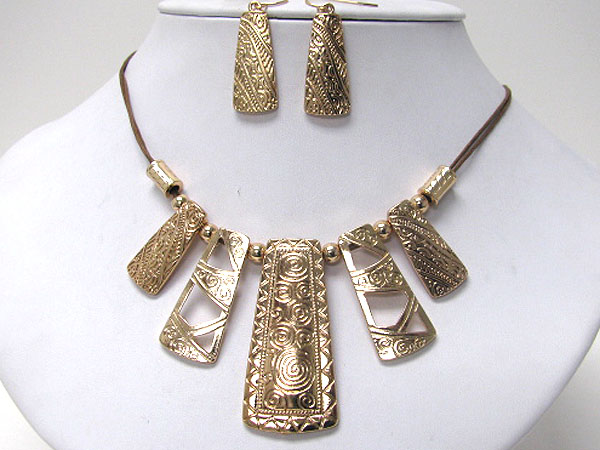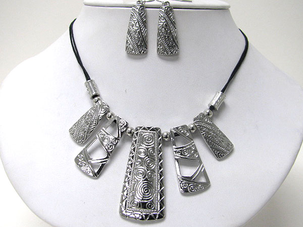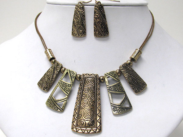 Tribal look metal art bar drop cord necklace earring set
