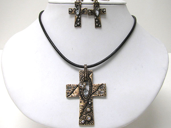 WHOLESALE CRYSTAL DECO METAL ART CROSS CORD NECKLACE EARRING SET 366191