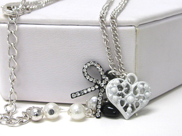 WHOLESALE CRYSTAL DECO RIBBON AND HEART MULTI CHARM NECKLACE EARRING SET 366549