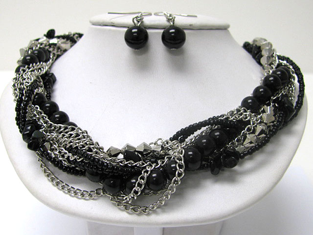 WHOLESALE PEARL AND CHIP STONE BRAIDED MULTI STRAND METAL CHAIN NECKALCE EARRING SET 366594