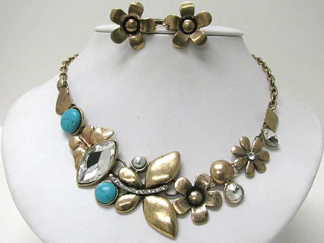 Turquoise stone and crystal deco metal butterfly and flower link neckalce earring set
