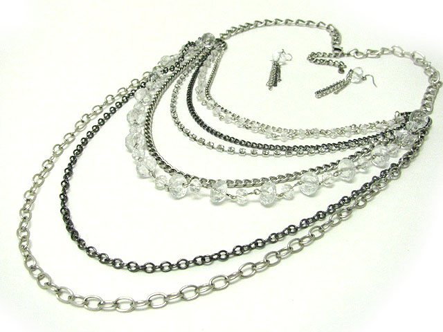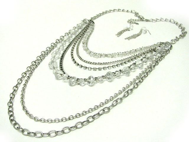 Multi row facet glass beads and mixed metal chain long chain neckalce earring set