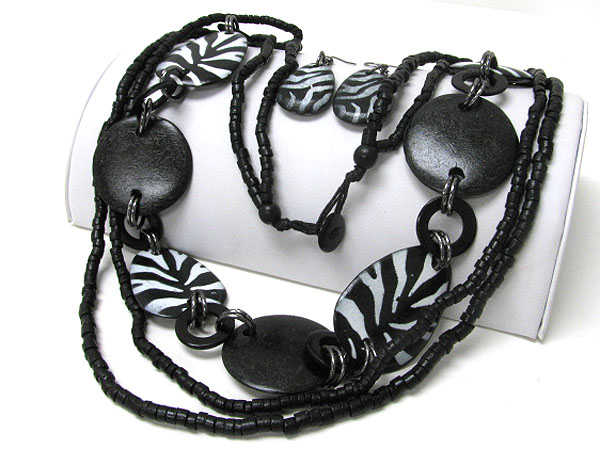 Eco friendly tropical wooden beads and animal print disk link long necklace earring set
