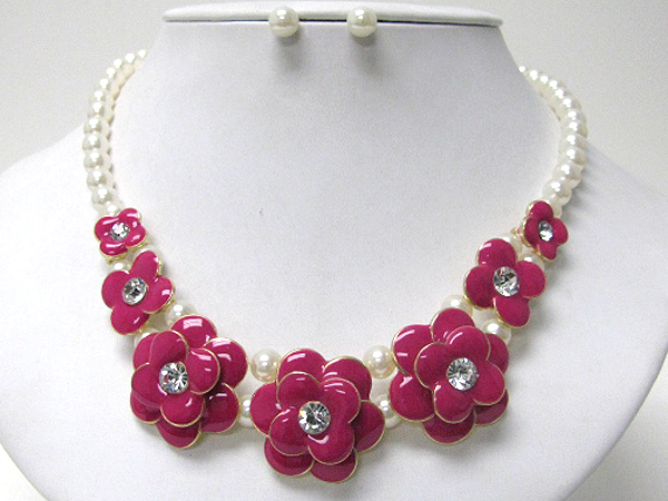 Crystal center epoxy flowers and pearl chain necklace earring set