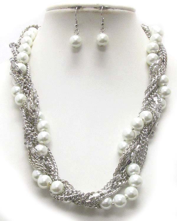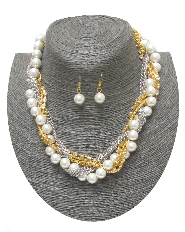 WHOLESALE MULTI PEARL AND METAL CHAIN TWIST NECKLACE EARRING SET 370154