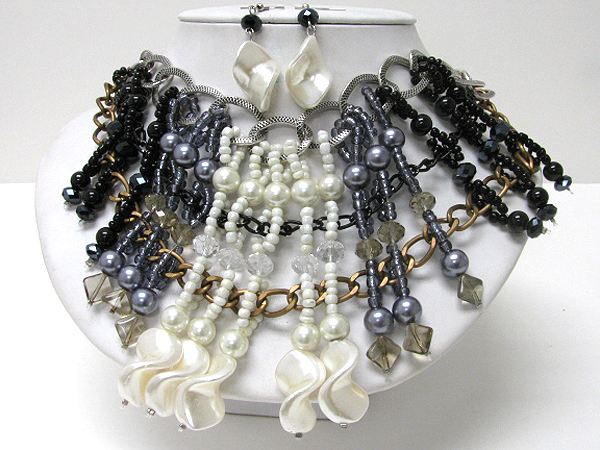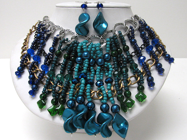 WHOLESALE MULTI MATERIAL MIX AND LINK CHAIN BIB NECKLACE EARRING SET 370414