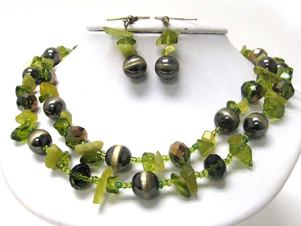Natural chip stone glass beads metallic ball mix necklace earring set