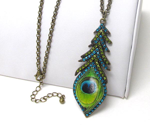 WHOLESALE CRYSTAL AND EPOXY DECO PEACOCK FEATHER PENDANT LONG NECKLACE 373500