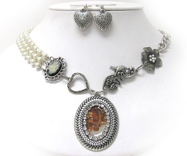 WHOLESALE RETRO VINTAGE PEARL AND ANTIQUE CHARM DANGLE NECKLACE EARRING SET 374455