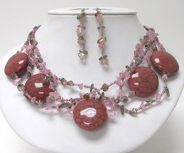 WHOLESALE FIGURINE PUFF DISK AND CHIP STONE NECKLACE EARRING SET 374741