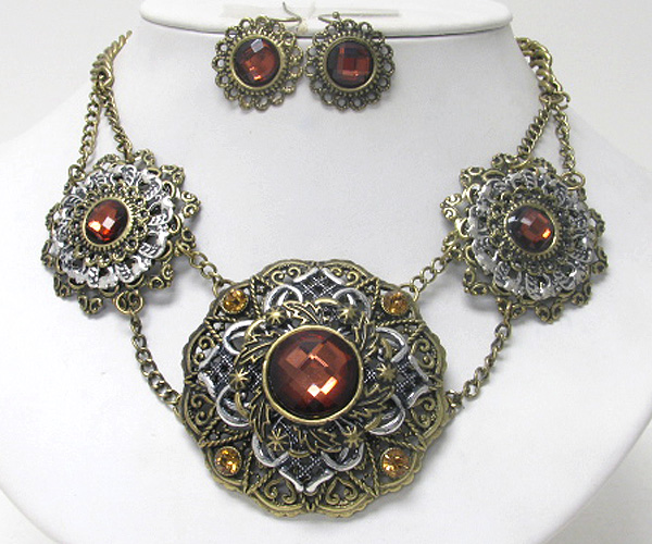 WHOLESALE FACET GLASS AND CRYSTAL DECO ON METAL FILIGREE DISK LINK NECKLACE EARRING SET 374799