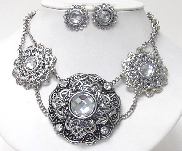 Facet glass and crystal deco on metal filigree disk link necklace earring set