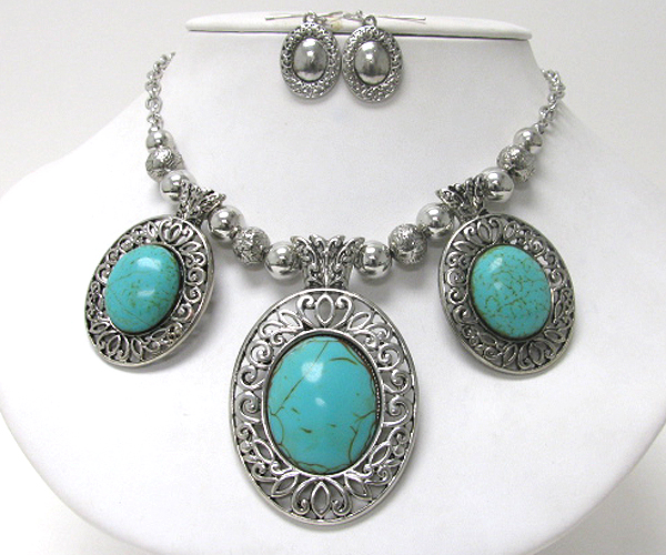 WHOLESALE TRI NATURAL STONE OVAL PENDANT DANGLE NECKLACE EARRING SET 374910