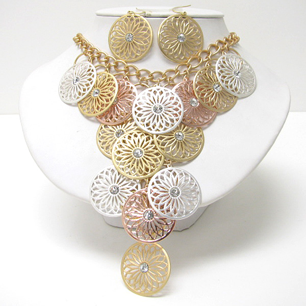 WHOLESALE EXTRA LONG CHUNKY SPRING VINTAGE MIXED METAL FILIGREE DISK DROP NEKLACE EARRING SET 375409
