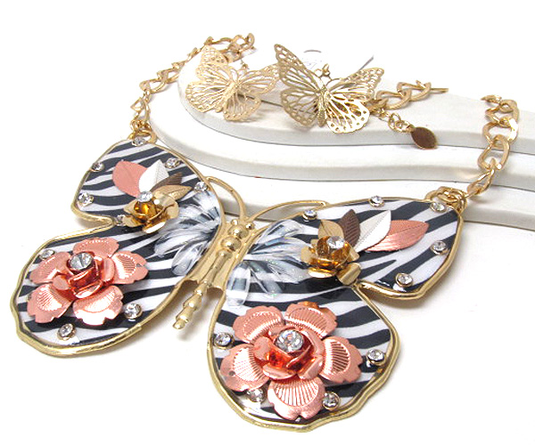 Crystal metal flower print zebra inside fashion large butterfly necklace earring set