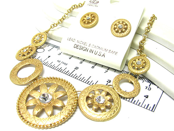WHOLESALE CRYSTAL ROUND SEVEN DISK TEXTURED WITH FLOWER CAHIN NECKLACE EARRING SET 376983