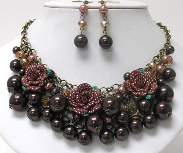 Crystal glass and multi ball with acryl flowers drop down metal chain necklace earring set