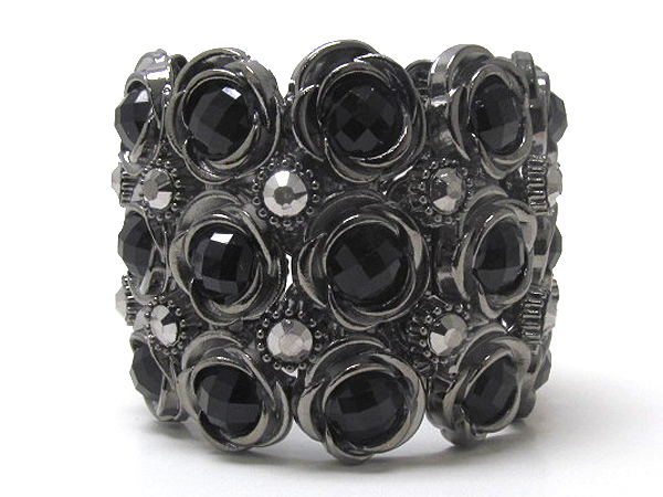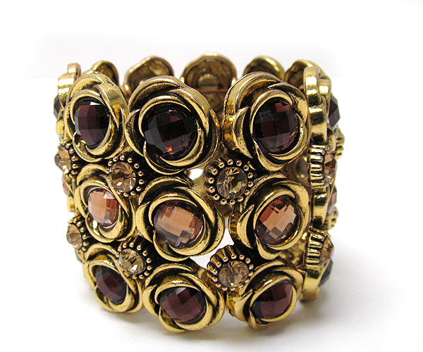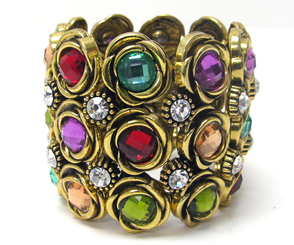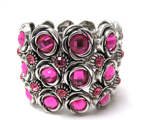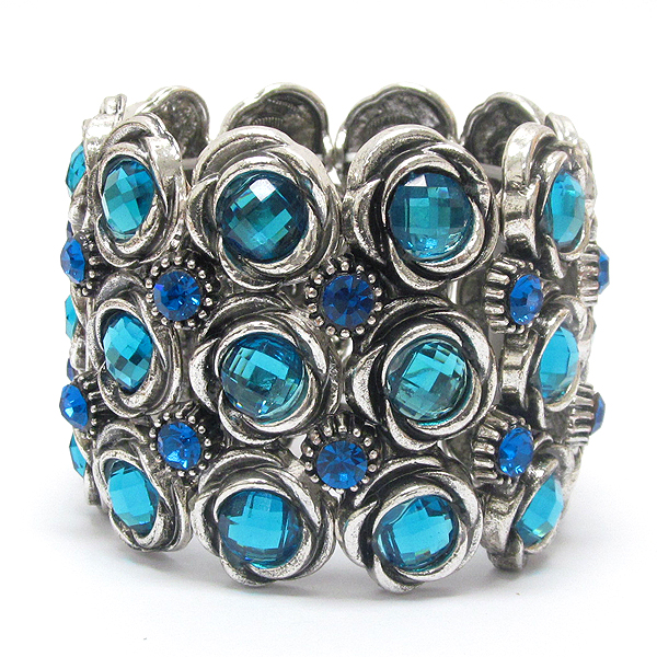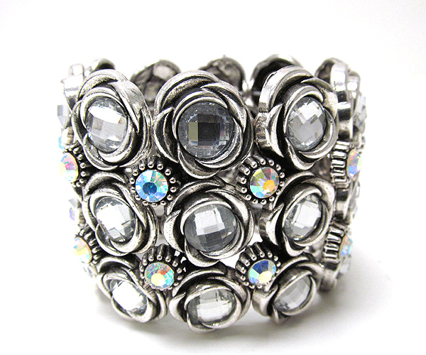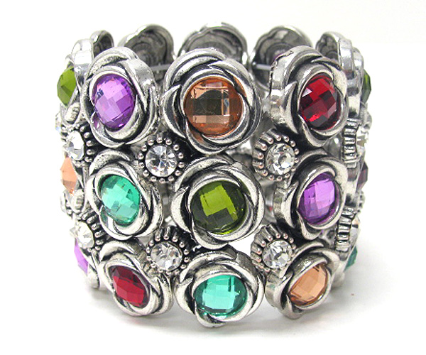 Multi crystal flower theme link metal stretch bracelet
