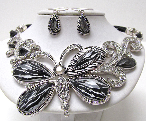 WHOLESALE ANIMAL PRINT AND MULTI CRYSTAL CURVE SIDES AND DROP DECO BUTTERFLY PENDANT CORD NECKLACE EARRING SET 377153