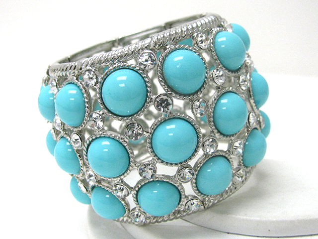 Crystal and acryl stone deco wide metal stretch bracelet