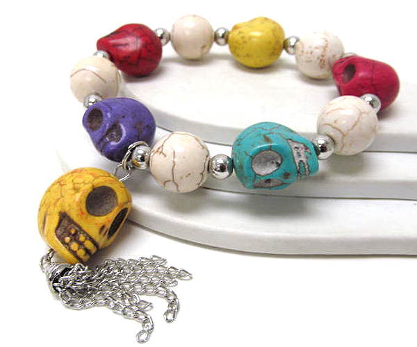 Semi precious stone skull theme and balls with drop chain skull stretch bracelet