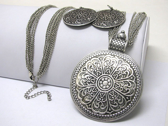 WHOLESALE METAL LARGE ROUND TEXTURED DISK PENDANT DROP LONG CHAIN NECKLACE EARRING SET 378136