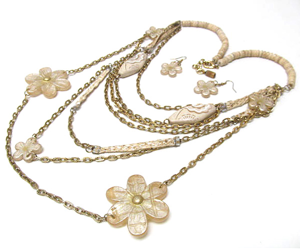 WHOLESALE MULTI LAYERD CHAIN WITH WOODEN ARROWHEAD AND ACRYL FLOWERS MULTI ROUND WOODEN CHAIN NECKLACE EARRING SET 378533