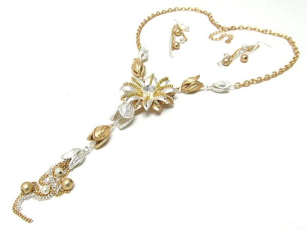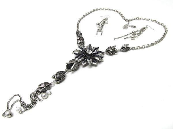 Crystal metal flower with seed beads and drop metal dangle leafs long chian necklace earring set