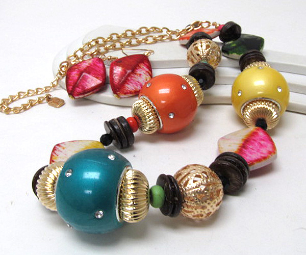 Multi wood rings and crystal acrly balls and metal balls with fashion acryl triangle chain necklace earring set