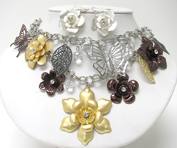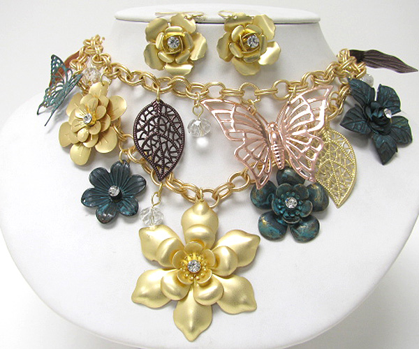 WHOLESALE CHUNKY SPRING VINTAGE MIXED CRYSTAL METAL FLOWERS AND BUTTERFLY WITH CRYSTAL GLASS LINK NEKLACE EARRING SET 379900