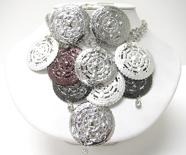 WHOLESALE CHUNKY SPRING VINTAGE MIXED METAL FILIGREE DISK CASCADE DROP NEKLACE EARRING SET 379901