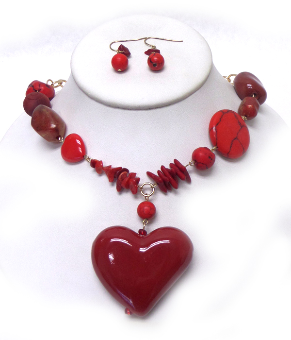 WHOLESALE MULTI MIXED NATURAL STONES WITH ROUND WOOD DROP FASHION NATURAL STONE HEART CHAIN DROP NECKLACE EARRING SET 379904