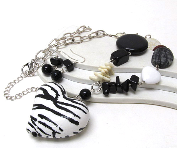 Multi mixed natural stones with round wood drop fashion natural stone heart chain drop necklace earring set