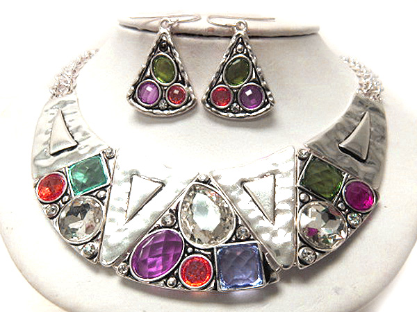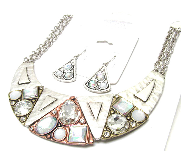 WHOLESALE CRYSTAL TEAR DROP HAMMERED TEXTURE METAL TRIANGLE DROP CHAIN NECKLACE EARRING SET 380653