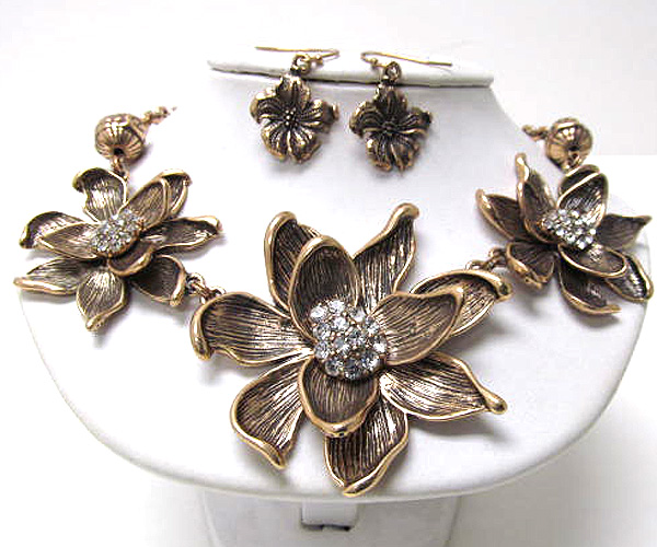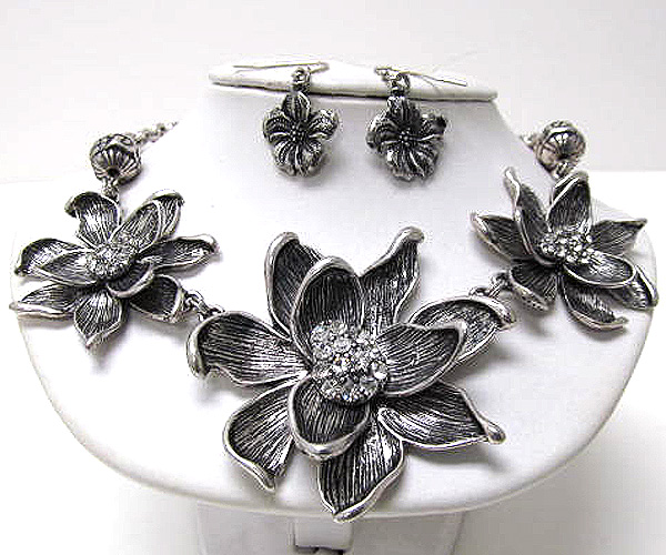 Multi crystal on three metal fashion bend flowers chain necklace earring set
