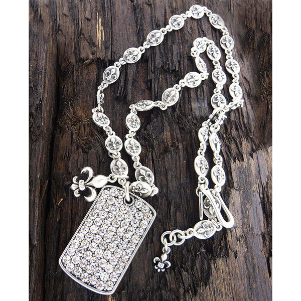 Mens stainless steel metal chain necklace - crystal dogtag and fleur de lis pendant