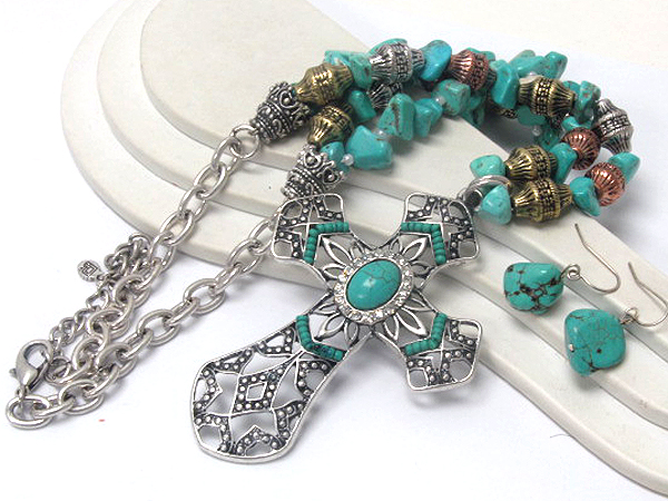 WHOLESALE MULTI SEED BEADS AND CENTER TURQUOISE STONE WITH CRYSTAL METAL FASHION CROSS DROP MULTI NATURAL STONE AND METAL ARROWHEAD CHAIN NECKLACE EARRING SET 381301