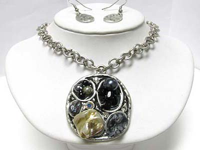 Natural stone and beads art deco metal oval pendant chip stone necklace earring set